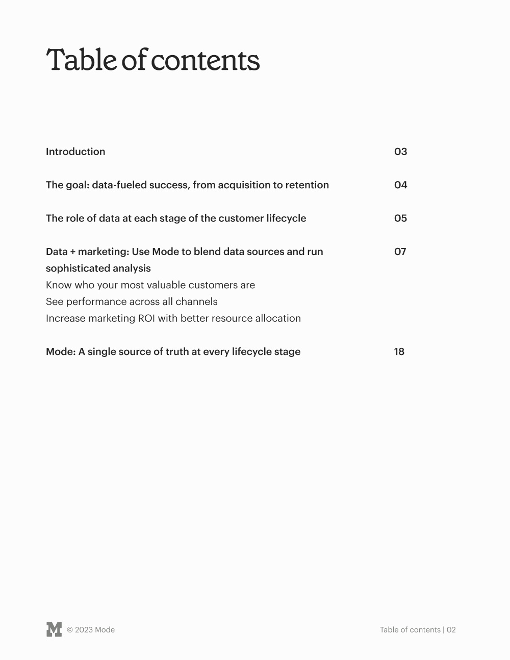 Use this guide to help set up your marketing team in Mode. Better understand the metrics they’re looking for and get inspired with sample charts they can use to accelerate their goals.