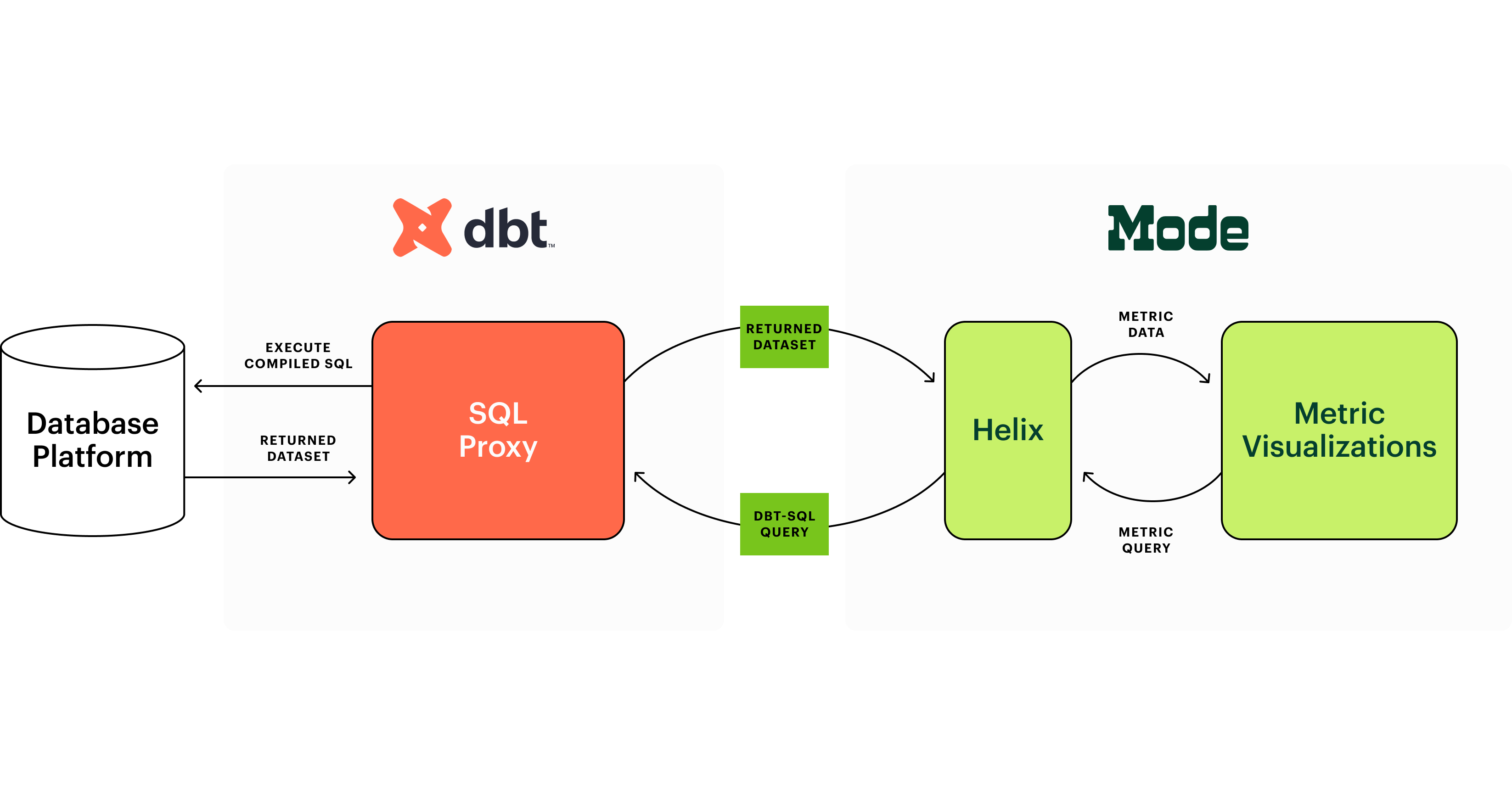 Our architectural approach to the integration leverages the dbt Proxy server and Helix, our own in-memory data engine in situationally-dependent ways. For changes that require getting new data or re-running a metric, Mode relies only on the logic built in dbt, using Helix simply as a proxy. This means we don’t perform any additional manipulation of the data within Mode, preventing common mistakes like aggregating aggregates, or summing distinct values.