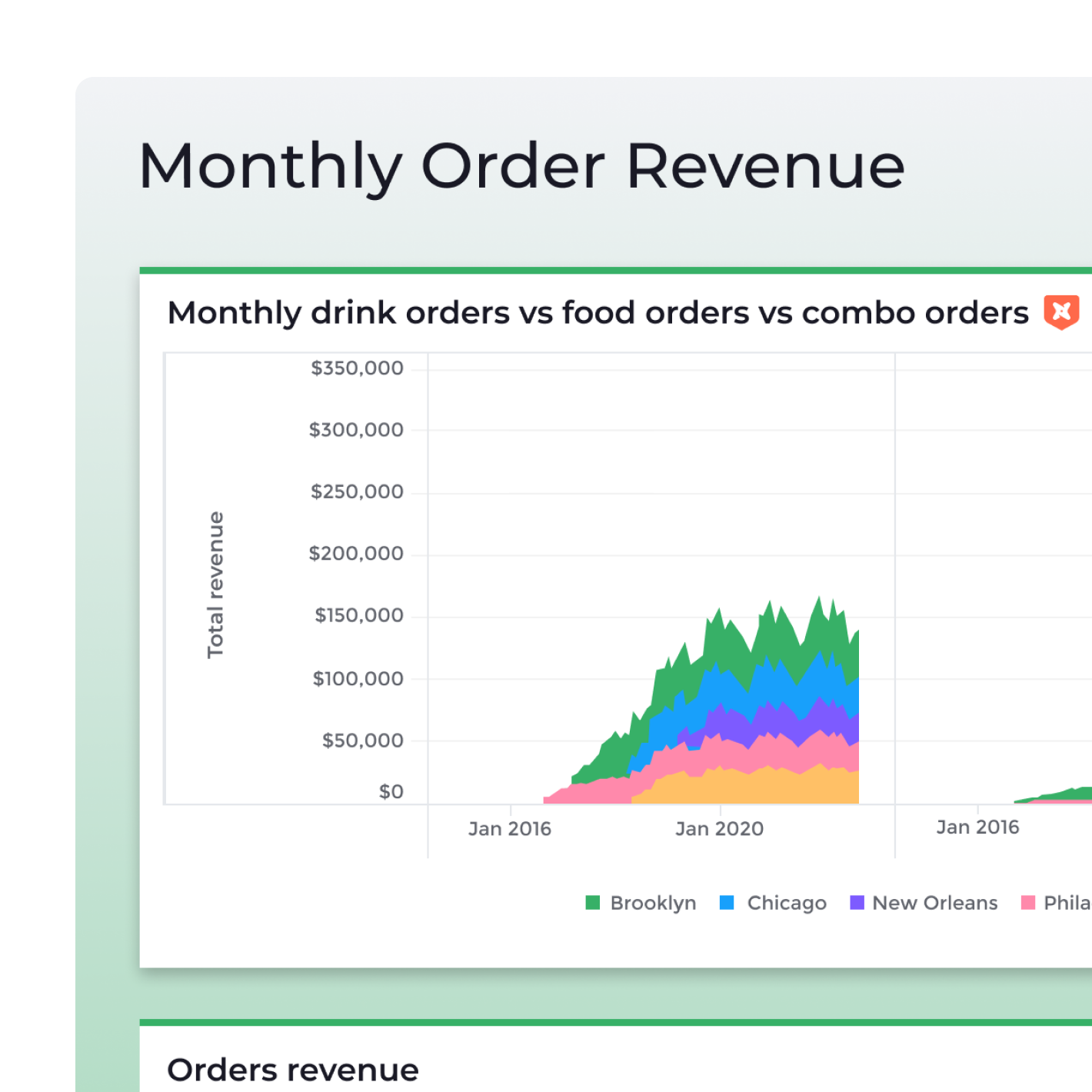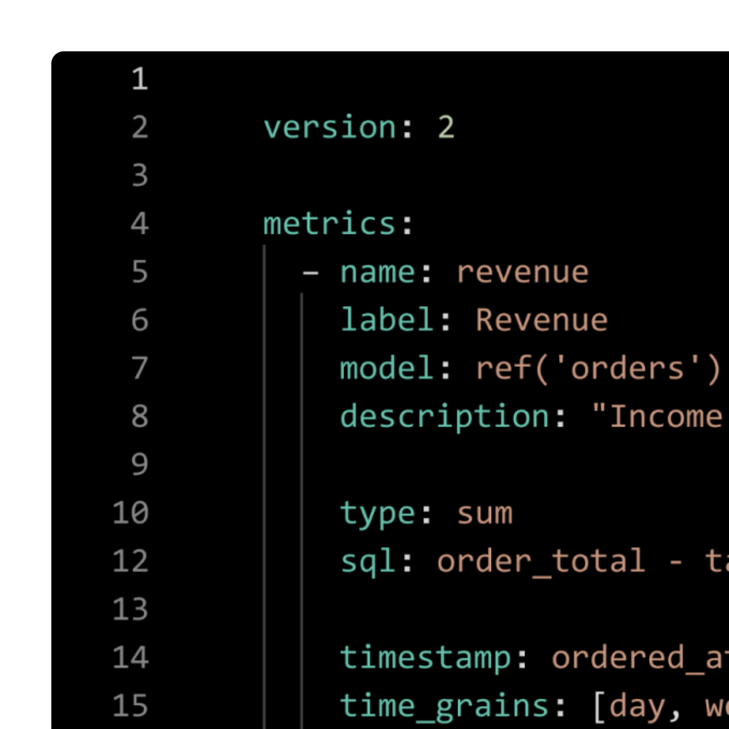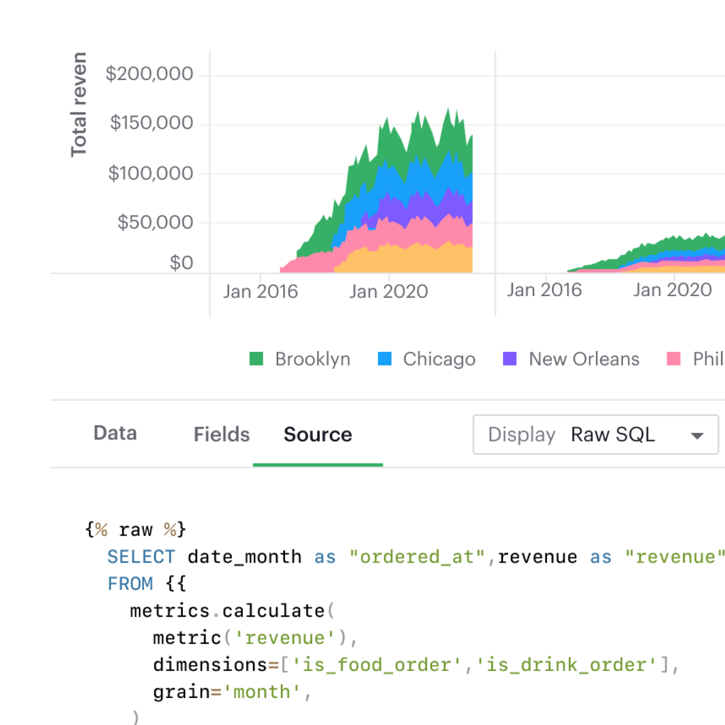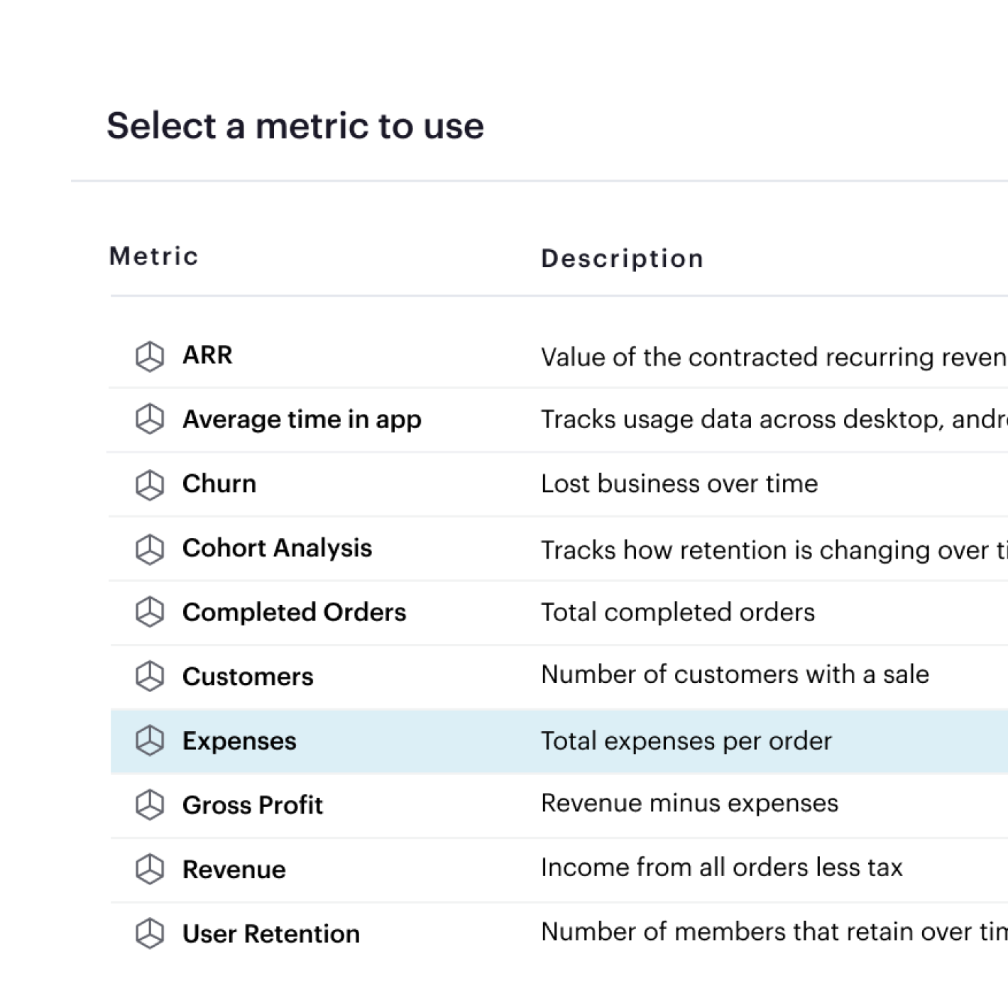 Make your most important company metrics automatically available to business teams for confident data exploration and self-serve reporting. 100% accuracy, 100% of the time, with no code required.