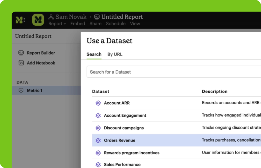Drag-and-drop your way through governed datasets and metrics, iterating through as many visualizations as you need to understand your data and find that aha moment.